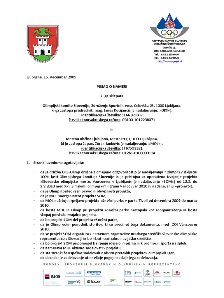 Pri tovrstnem zapisu je pomembno kaj sta pogajalca zapisala in ne kako sta takšen zapis poimenovala. Stičišče odprtih podatkov Slovenije se bo prizadevalo za integralno celostno sodelovanje k spodbujanju in promociji ter razvoju odpiranja podatkov ter ponovne uporabe odprtih podatkov z. Pismo o nameri ali angleško letter of intent LOI ali LoI je pisna izjava ene izmed strank oziroma obeh strank pogosto gospodarskih družb glede nameravane sklenitve pravnega posla.