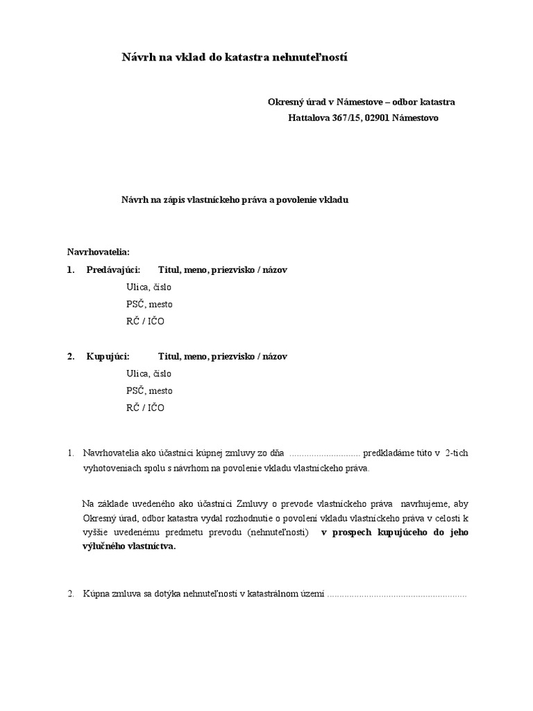 Navrh Na Vklad Do Katastra Nehnuteľnosti Pdf