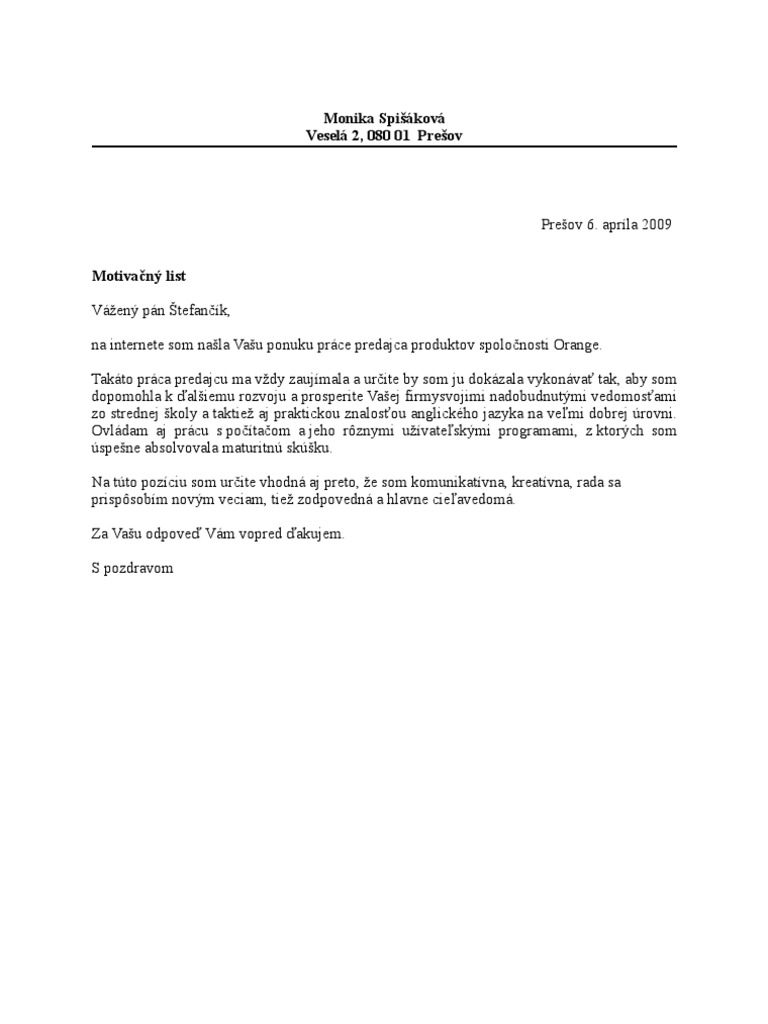 Motivačný list Na základe Vášho inzerátu v denníku Sme dňa 09062006 sa uchádzam o pracovnú pozíciu asistenta obchodného manažéra. Doplňte svoj životopis pôsobivým sprievodným listom. Motivacny list administrativna pracovnicka vzor.